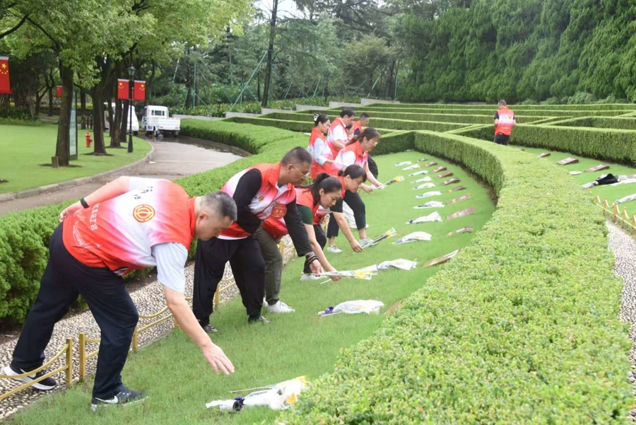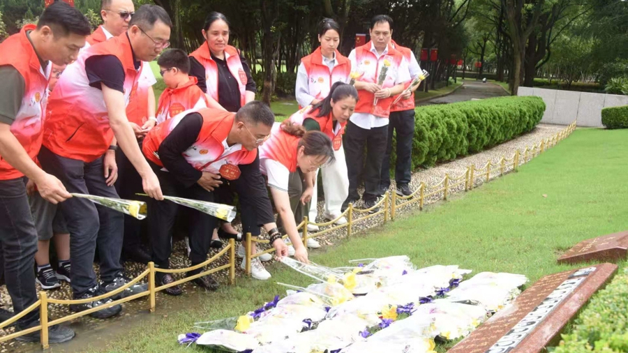 今天是国家烈士纪念日。在庄严肃穆的龙华烈士陵园内,徐汇区总工会组织的劳模龙陵志愿讲解服务队成员携手学生志愿者、工会志愿者,开展集体祭扫活动。一束束鲜花轻轻敬献在烈士墓前,志愿者们在讲解中曾不断提到的那些名字就铭刻在墓碑上,他们的形象浮现在心中,传递出舍生忘死的感人精神。